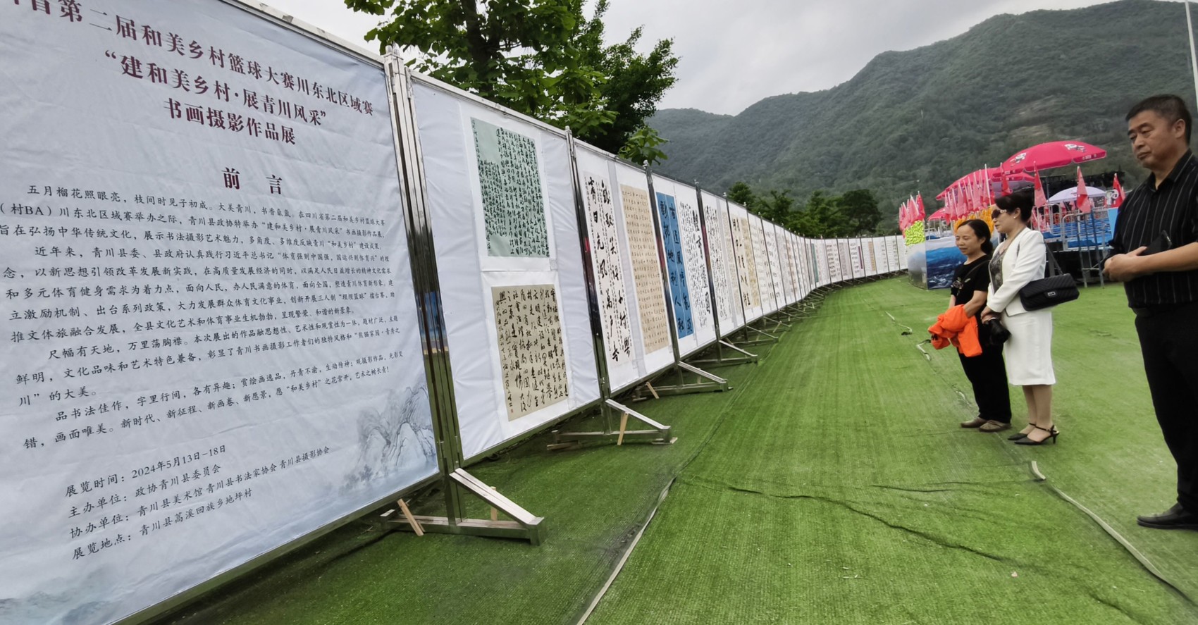 书法作品挥洒自如、绘画作品生动传神、摄影作品光影交错……在四川省第二届和美乡村篮球大赛(村BA)川东北区域赛之际,与球场相呼应,外围的“建和美乡村·展青川风采”书画摄影作品展一字排开,引来观众驻足围观。