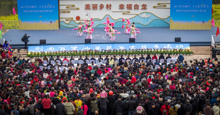 3月19日,剑阁县“剑南百里油菜花海赏花季”在白龙镇启幕,千亩金色花浪与青山古村相映成趣,吸引众多游客前来踏春。开幕式上,非遗“白龙花灯”流光溢彩,舞蹈《玉盘花灯》、戏曲《国韵》等表演点燃现场,游客纷纷举起手机记录精彩瞬间。